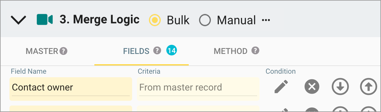 Bulk mode (recommended) automatically merges all duplicate groups according to the master record selection rules you define in the Master tab. This is the right choice for most deduplication processes, and the only mode that supports templates, Recipes, and automation.